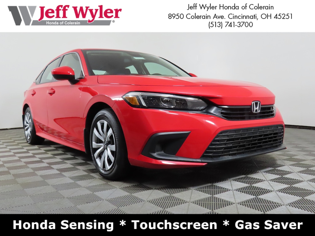 Jeff Wyler Honda of Colerain is pleased to offer this charming 2024 Honda Civic LX in Rallye Red. Well equipped with: 16" Wheels w/Full Covers, 4 Speakers, 4-Wheel Disc Brakes, ABS brakes, Adaptive Cruise Control: Adaptive Cruise Control (ACC) with Low-Speed Follow, Air Conditioning, AM/FM radio, Apple CarPlay/Android Auto, Auto High-beam Headlights, Automatic temperature control, Brake assist, Bumpers: body-color, Cloth Seating Surfaces, Delay-off headlights, Driver door bin, Driver vanity mirror, Dual front impact airbags, Dual front side impact airbags, Electronic Stability Control, Emergency communication system: HondaLink, Exterior Parking Camera Rear, Four wheel independent suspension, Front anti-roll bar, Front Bucket Seats, Front Center Armrest, Front reading lights, Fully automatic headlights, Illuminated entry, Knee airbag, Low tire pressure warning, Occupant sensing airbag, Outside temperature display, Overhead airbag, Panic alarm, Passenger door bin, Passenger vanity mirror, Power door mirrors, Power steering, Power windows, Radio data system, Radio: 160-Watt Audio System, Rear anti-roll bar, Rear side impact airbag, Rear window defroster, Remote keyless entry, Security system, Speed control, Speed-sensing steering, Steering wheel mounted audio controls, Tachometer, Telescoping steering wheel, Tilt steering wheel, Traction control, and Trip computer.