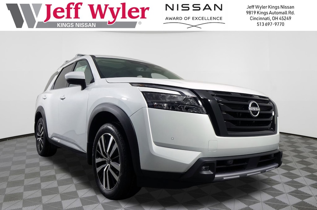 $10,269 off MSRP! Jeff Wyler Kings Nissan is proud to offer this outstanding-looking 2025 Nissan Pathfinder Platinum in Everest White Pearl Tricoat. Well equipped with: Black Appearance Package (Black Grille and Black Liftgate Emblems), Cargo Package (Cargo Area Protector, Cargo Net, and First Aid), Lighting Package (N92) (Illuminated Kick Plate and Welcome Lighting), 4WD, 13 Speakers, 3rd row seats: bench, 4-Wheel Disc Brakes, ABS brakes, Air Conditioning, Alloy wheels, AM/FM radio: SiriusXM, Auto High-beam Headlights, Auto tilt-away steering wheel, Auto-dimming Rear-View mirror, Automatic temperature control, Bench Seat Carpeted Floor Mats (Set of 4), Bodyside moldings, Bose Premium Audio System, Brake assist, Bumpers: body-color, Climate Controlled Front Bucket Seats, Cross Bars, Delay-off headlights, Driver door bin, Driver vanity mirror, Dual front impact airbags, Dual front side impact airbags, Electronic Stability Control, Emergency communication system, Exterior Parking Camera Rear, Four wheel independent suspension, Front anti-roll bar, Front Bucket Seats, Front Center Armrest, Front dual zone A/C, Front reading lights, Fully automatic headlights, Garage door transmitter: HomeLink, Heads-Up Display, Heated door mirrors, Heated front seats, Heated rear seats, Heated steering wheel, Illuminated entry, Knee airbag, Leather steering wheel, LED Fog Lamps, Low tire pressure warning, Memory seat, Navigation system: NissanConnect with Navigation and Services, NissanConnect featuring Apple CarPlay and Android Auto, NissanConnect w/Navigation & Services, Occupant sensing airbag, Outside temperature display, Overhead airbag, Overhead console, Panic alarm, Passenger door bin, Passenger vanity mirror, Power door mirrors, Power driver seat, Power Liftgate, Power moonroof, Power passenger seat, Power steering, Power windows, Premium Paint, Radio data system, Radio: AM/FM Audio System, Rain sensing wipers, Rear air conditioning, Rear anti-roll bar, Rear reading lights, Rear seat center armrest, Rear side impact airbag, Rear window defroster, Rear window wiper, Reclining 3rd row seat, Remote keyless entry, Security system, Semi-Aniline Leather-Appointed Seating Surfaces, Speed control, Speed-sensing steering, Speed-Sensitive Wipers, Split folding rear seat, Spoiler, Steering wheel memory, Steering wheel mounted audio controls, Tachometer, Telescoping steering wheel, Tilt steering wheel, Traction control, Trip computer, Turn signal indicator mirrors, Variably intermittent wipers, Ventilated front seats, and Wheels: 20" x 8J Machined Alloy.Wyler Family First Package Includes: NanoCure Appearance Protection: Exterior & Interior Chemical Sealant Applied to Protect Against Environmental Hazards (7 Year Warranty Coverage). Pulse- Rear end Collision Avoidance System Theft Deterrent Strategy gives you 5 Years of Coverage against vehicle Theft, Offering up to a $5,000 benefit. Used vehicles 10 years of age or newer with less than 100,000 miles are eligible for the Wyler Assurance Program, but eligible vehicles must pass our reconditioning process and multi-point inspection. Provided the vehicle passes inspection, vehicles will be eligible for the 6 month/6,000 mile limited warranty. The 6 month/6,000 mile limited warranty is NOT available on AS-IS vehicles, wholesale vehicles, lease buyback/pass-thru vehicles or un-inspected vehicles. Note that this program can also apply to vehicles where the remaining factory coverage is less than 6 months or 6,000 miles. Please check the Federal Trade Commission (FTC) Buyers guide on the vehicle for full details as to whether or not warranty coverage may apply. Contact Dealer for additional details. The Wyler Assurance 6 month/6,000 Mile limited warranty ends 6 months from the date of the Retail Purchase Agreement (BUYERS ORDER) or when the vehicle's odometer registers 6,000 additional miles to the mileage listed on the BUYERS ORDER, whiche Price includes: $5000 - Nissan Customer Cash. Exp. 11/03/2025