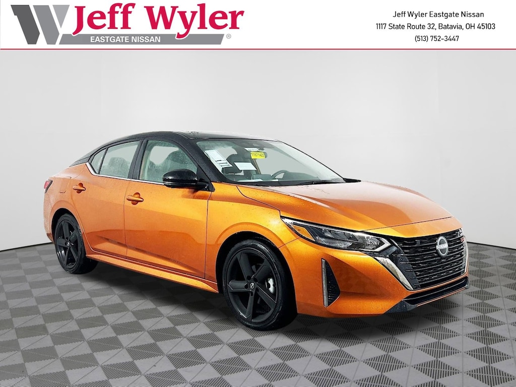 Monarch Orange Metallic/Super Black 2025 Nissan Sentra SR 2.0L I4 DOHC FWD CVT with Xtronic 30/38 City/Highway MPG Jeff Wyler Eastgate Auto Mall is honored to offer this terrific 2025 Nissan Sentra SR in Monarch Orange Metallic/Super Black. Well equipped with: SR Premium Package (6-Way Power Driver's Seat, Bose Premium Audio System w/8 Speakers, Intelligent Around View Monitor (I-AVM), Leather Heated Steering Wheel, Leatherette Seat Trim, NissanConnect Services, Power Sliding Glass Moonroof w/Tilt Feature, Sunvisors w/Illuminated Vanity Mirrors, and Wi-Fi Hotspot), 18" Alloy Wheels, 18" Black Alloy Wheels, 2-Tone Premium Paint, 4-Wheel Disc Brakes, 8 Speakers, ABS brakes, Air Conditioning, Alloy wheels, AM/FM radio: SiriusXM, Auto High-beam Headlights, Automatic temperature control, Blind Spot Warning, Brake assist, Bumpers: body-color, Carpeted Floor Mats w/Trunk Mat, Clear Rear Bumper Protector, Delay-off headlights, Door Sill Plates, Driver door bin, Driver vanity mirror, Dual front impact airbags, Dual front side impact airbags, Electronic Stability Control, Four wheel independent suspension, Front anti-roll bar, Front Bucket Seats, Front Center Armrest, Front dual zone A/C, Front reading lights, Fully automatic headlights, Heated door mirrors, Heated Front Bucket Seats, Heated front seats, Illuminated entry, Knee airbag, Leather Shift Knob, Low tire pressure warning, Map Pocket Lighting, NissanConnect featuring Apple CarPlay and Android Auto, Occupant sensing airbag, Outside temperature display, Overhead airbag, Overhead console, Panic alarm, Passenger door bin, Passenger vanity mirror, Power door mirrors, Power steering, Power windows, Radio data system, Radio: AM/FM w/RDS/MP3/Aux-In, Rear anti-roll bar, Rear Parking Sensors, Rear seat center armrest, Rear side impact airbag, Rear window defroster, Remote keyless entry, Security system, Speed control, Speed-sensing steering, Split folding rear seat, Spoiler, Sport Cloth Seat Trim, Steering wheel mounted audio controls, Tachometer, Telescoping steering wheel, Tilt steering wheel, Traction control, Trip computer, Turn signal indicator mirrors, and Variably intermittent wipers. 30/38 City/Highway MPG Price includes: $500 - Nissan MY25 Sentra Bonus Cash. Exp. 11/03/2025