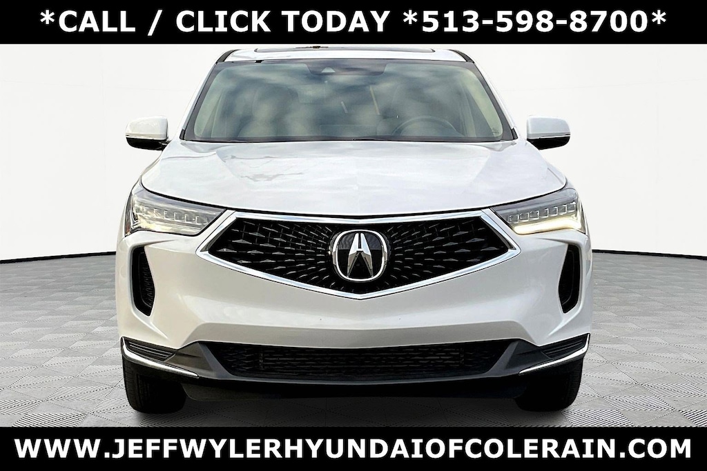Jeff Wyler Hyundai of Colerain is honored to offer this terrific 2023 Acura RDX in White. Well equipped with: 4-Wheel Disc Brakes, 4.17 Axle Ratio, 9 Speakers, ABS brakes, Air Conditioning, Alloy wheels, AM/FM radio: SiriusXM, Apple CarPlay/Android Auto, Auto High-beam Headlights, Auto-dimming Rear-View mirror, Automatic temperature control, Brake assist, Bumpers: body-color, Compass, Delay-off headlights, Driver door bin, Driver vanity mirror, Dual front impact airbags, Dual front side impact airbags, Electronic Stability Control, Emergency communication system: AcuraLink, Exterior Parking Camera Rear, Four wheel independent suspension, Front anti-roll bar, Front Bucket Seats, Front Center Armrest, Front dual zone A/C, Front reading lights, Fully automatic headlights, Garage door transmitter: HomeLink, Heated door mirrors, Heated front seats, Heated Front Sport Seats, Illuminated entry, Knee airbag, Lane departure: Lane Keeping Assist System (LKAS) active, Leatherette-Trimmed Interior, Low tire pressure warning, Memory seat, Occupant sensing airbag, Outside temperature display, Overhead airbag, Overhead console, Panic alarm, Passenger door bin, Passenger vanity mirror, Power door mirrors, Power driver seat, Power Liftgate, Power moonroof, Power passenger seat, Power steering, Power windows, Premium Audio System, Radio data system, Rear anti-roll bar, Rear reading lights, Rear seat center armrest, Rear window defroster, Rear window wiper, Remote keyless entry, Security system, Speed control, Speed-sensing steering, Split folding rear seat, Spoiler, Steering wheel mounted audio controls, Tachometer, Telescoping steering wheel, Tilt steering wheel, Traction control, Trip computer, Turn signal indicator mirrors, Variably intermittent wipers, and Wheels: 19" x 8.0J Sparkle Silver Multi-Spoke. CARFAX One-Owner. This sales price excludes tax, title, and dealer fees. While every reasonable effort is made to ensure the accuracy of this information, we are not responsible for any errors or omissions contained on these pages. Used vehicles 10 years of age or newer with less than 100,000 miles are eligible for the Wyler Assurance Program, but eligible vehicles must pass our reconditioning process and multi-point inspection. Provided the vehicle passes inspection, vehicles will be eligible for the 6 month/6,000 mile limited warranty. The 6 month/6,000 mile limited warranty is NOT available on AS-IS vehicles, wholesale vehicles, lease buyback/pass-thru vehicles or un-inspected vehicles. Note that this program can also apply to vehicles where the remaining factory coverage is less than 6 months or 6,000 miles. Please check the Federal Trade Commission (FTC) Buyers guide on the vehicle for full details as to whether or not warranty coverage may apply. Contact Dealer for additional details. The Wyler Assurance 6 month/6,000 Mile limited warranty ends 6 months from the date of the Retail Purchase Agreement (BUYERS ORDER) or when the vehicle's odometer registers 6,000 additional miles to the mileage listed on the BUYERS ORDER, whichever comes first.Your Deductible - The warranty holder on your contract pays the first $100 of each covered repair.
