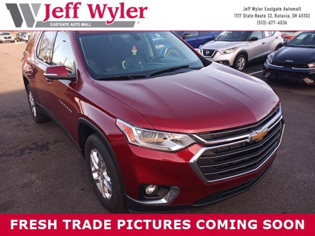 Jeff Wyler Eastgate Auto Mall is very proud to offer this fantastic-looking 2021 Chevrolet Traverse LT in Cajun Red Tintcoat. Well equipped with: Convenience & Driver Confidence Package (4.2" Multi-Color Enhanced Driver Instrument Display, Heated Driver & Front Passenger Seats, Lane Change Alert w/Side Blind Zone Alert, Radio: Chevrolet Infotainment 3 Plus System, Rear Cross Traffic Alert, Rear Park Assist w/Audible Warning, Rear Power Liftgate, Remote Start, SiriusXM w/360L, and Universal Home Remote), Preferred Equipment Group 1LT, 3.49 Axle Ratio, 3rd row seats: split-bench, 4-Wheel Disc Brakes, 6 Speakers, 7-Passenger Seating (2-2-3 Seating Configuration), ABS brakes, Air Conditioning, Alloy wheels, AM/FM radio: SiriusXM, Apple CarPlay/Android Auto, Automatic temperature control, Brake assist, Bumpers: body-color, Compass, Delay-off headlights, Driver door bin, Driver vanity mirror, Dual front impact airbags, Dual front side impact airbags, Electronic Stability Control, Emergency communication system: OnStar and Chevrolet connected services capable, Four wheel independent suspension, Front anti-roll bar, Front Bucket Seats, Front Center Armrest, Front dual zone A/C, Front fog lights, Front reading lights, Fully automatic headlights, Heated door mirrors, High-Intensity Discharge Headlights, Illuminated entry, Leather steering wheel, Low tire pressure warning, Occupant sensing airbag, Outside temperature display, Overhead airbag, Overhead console, Panic alarm, Passenger door bin, Passenger vanity mirror, Power door mirrors, Power driver seat, Power steering, Power windows, Premium Cloth Seat Trim, Radio data system, Radio: Chevrolet Infotainment System AM/FM Stereo, Rear air conditioning, Rear anti-roll bar, Rear reading lights, Rear window defroster, Rear window wiper, Remote keyless entry, Roof rack: rails only, Security system, SiriusXM Radio, Speed control, Speed-sensing steering, Spoiler, Steering wheel mounted audio controls, Tachometer, Telescoping steering wheel, Tilt steering wheel, Traction control, Trip computer, Turn signal indicator mirrors, Variably intermittent wipers, Voltmeter, and Wheels: 18" Bright Silver Painted Aluminum. CARFAX One-Owner. Clean CARFAX. Awards: * 2021 IIHS Top Safety Pick with optional front crash prevention and specific headlights Ask about available certifications. Used vehicles 10 years of age or newer with less than 100,000 miles are eligible for the Wyler Assurance Program, but eligible vehicles must pass our reconditioning process and multi-point inspection. Provided the vehicle passes inspection, vehicles will be eligible for the 6 month/6,000 mile limited warranty. The 6 month/6,000 mile limited warranty is NOT available on AS-IS vehicles, wholesale vehicles, lease buyback/pass-thru vehicles or un-inspected vehicles. Note that this program can also apply to vehicles where the remaining factory coverage is less than 6 months or 6,000 miles. Please check the Federal Trade Commission (FTC) Buyers guide on the vehicle for full details as to whether or not warranty coverage may apply. Contact Dealer for additional details. The Wyler Assurance 6 month/6,000 Mile limited warranty ends 6 months from the date of the Retail Purchase Agreement (BUYERS ORDER) or when the vehicle's odometer registers 6,000 additional miles to the mileage listed on the BUYERS ORDER, whichever comes first. Your Deductible - The warranty holder on your contract pays the first $100 of each covered repair.