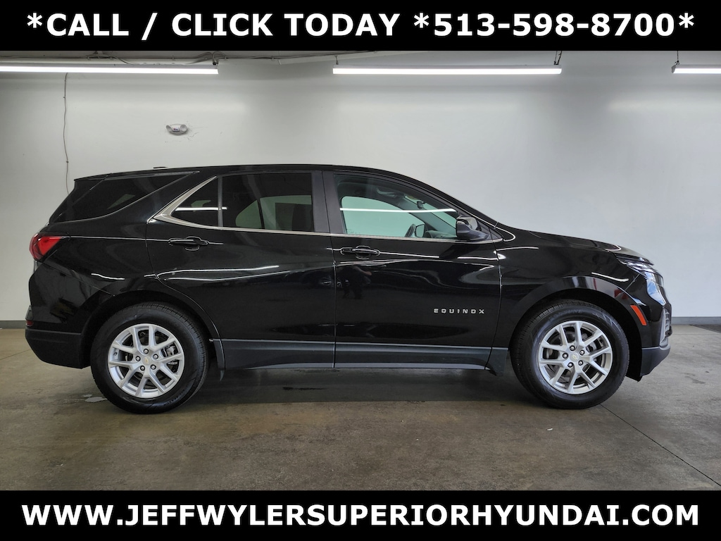 Jeff Wyler Superior Hyundai is excited to offer this outstanding-looking 2022 Chevrolet Equinox LT in Mosaic Black Metallic. Well equipped with: Confidence & Convenience Package, Driver Confidence II Package (Front & Rear Park Assist, Lane Change Alert w/Side Blind Zone Alert, and Rear Cross Traffic Alert), Driver Convenience Package (3-Spoke Leather-Wrapped Steering Wheel, Dual Zone Automatic Climate Control, Heated Driver & Front Passenger Seats, Rear Power Liftgate, and Remote Start), Preferred Equipment Group 1LT, 17" Aluminum Wheels, 2 Rear USB Charging-Only Ports, 2 USB Ports & Auxiliary Input Jack, 2-Way Power Driver Lumbar Control Seat Adjuster, 3.50 Final Drive Axle Ratio, 4-Wheel Disc Brakes, 6 Speaker Audio System Feature, 6 Speakers, 8-Way Power Driver Seat Adjuster, ABS brakes, Air Conditioning, Alloy wheels, AM/FM radio: SiriusXM, Auto High-beam Headlights, Bluetooth® For Phone, Brake assist, Bumpers: body-color, Compass, Delay-off headlights, Driver door bin, Driver vanity mirror, Dual front impact airbags, Dual front side impact airbags, Electronic Stability Control, Emergency communication system: OnStar and Chevrolet connected services capable, Four wheel independent suspension, Front & Rear Black Bowtie Emblems (LPO), Front anti-roll bar, Front Bucket Seats, Front Center Armrest, Front Passenger 4-Way Manual Seat Adjuster, Front reading lights, Fully automatic headlights, Heated door mirrors, Illuminated entry, Low tire pressure warning, Not Equipped w/Driver & Fr Pass Heated Seats, Occupant sensing airbag, Outside temperature display, Overhead airbag, Overhead console, Panic alarm, Passenger door bin, Passenger vanity mirror, Power door mirrors, Power driver seat, Power steering, Power windows, Premium audio system: Chevrolet Infotainment 3, Premium Cloth Seat Trim, Radio data system, Radio: Chevrolet Infotainment 3 System w/AM/FM, Rear anti-roll bar, Rear reading lights, Rear seat center armrest, Rear window defroster, Rear window wiper, Remote keyless entry, Security system, SiriusXM Radio, Speed control, Speed-sensing steering, Split folding rear seat, Spoiler, Steering wheel mounted audio controls, Tachometer, Telescoping steering wheel, Tilt steering wheel, Traction control, Trip computer, Variably intermittent wipers, and Wireless Apple CarPlay/Wireless Android Auto. CARFAX One-Owner. This sales price excludes tax, title, and dealer fees. While every reasonable effort is made to ensure the accuracy of this information, we are not responsible for any errors or omissions contained on these pages. Used vehicles 10 years of age or newer with less than 100,000 miles are eligible for the Wyler Assurance Program, but eligible vehicles must pass our reconditioning process and multi-point inspection. Provided the vehicle passes inspection, vehicles will be eligible for the 6 month/6,000 mile limited warranty. The 6 month/6,000 mile limited warranty is NOT available on AS-IS vehicles, wholesale vehicles, lease buyback/pass-thru vehicles or un-inspected vehicles. Note that this program can also apply to vehicles where the remaining factory coverage is less than 6 months or 6,000 miles. Please check the Federal Trade Commission (FTC) Buyers guide on the vehicle for full details as to whether or not warranty coverage may apply. Contact Dealer for additional details. The Wyler Assurance 6 month/6,000 Mile limited warranty ends 6 months from the date of the Retail Purchase Agreement (BUYERS ORDER) or when the vehicle's odometer registers 6,000 additional miles to the mileage listed on the BUYERS ORDER, whichever comes first.Your Deductible - The warranty holder on your contract pays the first $100 of each covered repair.