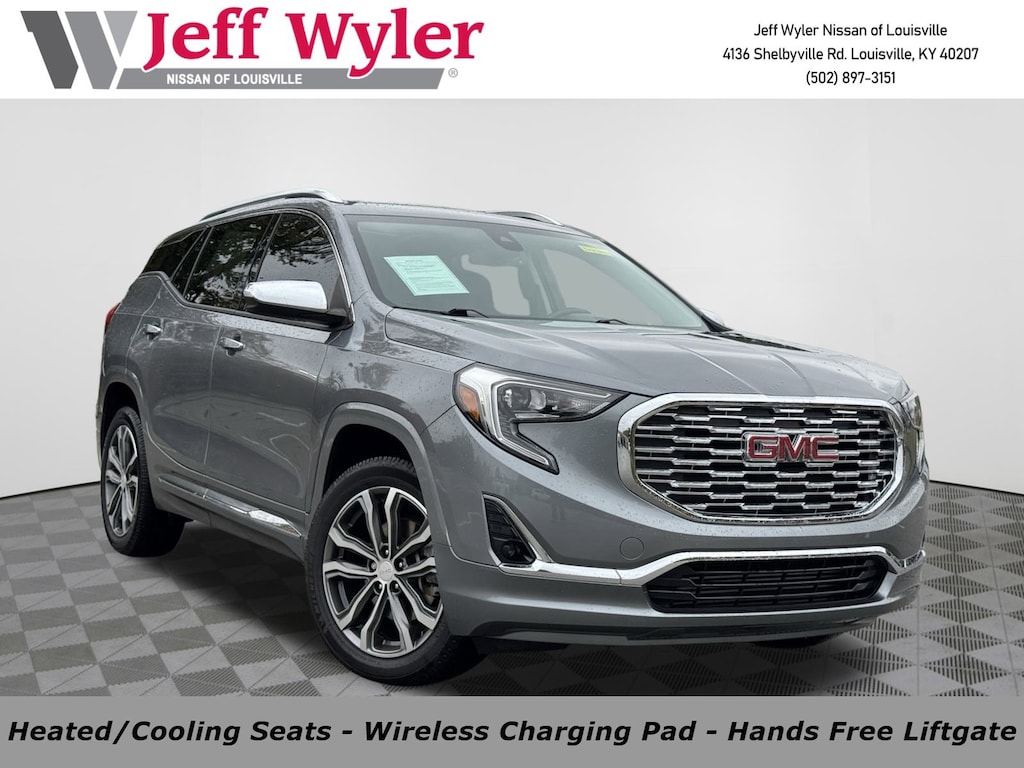 Jeff Wyler Nissan of Louisville is pumped up to offer this good-looking 2019 GMC Terrain Denali in Satin Steel Metallic. ** ALL WHEEL DRIVE/AWD **, ** BLUETOOTH **, ** NAVIGATION **, ** SUNROOF/MOONROOF **, ** BACKUP CAMERA **, ** LEATHER INTERIOR **, ** HEATED SEATS **, ** PUSH-BUTTON START **, ** EXCELLENT SERVICE HISTORY **, ** LOCALLY OWNED **, and ** HOME DELIVERY OPTIONS! ** Comfort Package (Heated Rear Outboard Seating Positions, Ventilated Driver Seat, and Ventilated Front Passenger Seat), Driver Alert Package II (Adaptive Cruise Control - Camera, Following Distance Indicator, Forward Collision Alert, Front Pedestrian Braking, IntelliBeam Auto High Beam Headlamp Control, Lane Keep Assist w/Lane Departure Warning, and Low Speed Forward Automatic Braking), Preferred Equipment Group 5SA, AWD, 2 USB Data Ports, 2 USB Data Ports w/SD Card Reader, 3.17 Axle Ratio, 4-Wheel Disc Brakes, 6-Way Power Front Passenger Seat, 7 Speakers, 8-Way Power Driver Seat Adjuster, ABS brakes, Air Conditioning, Alloy wheels, AM/FM radio: SiriusXM, Apple CarPlay/Android Auto, Auto-dimming door mirrors, Auto-dimming Rear-View mirror, Automatic temperature control, Bluetooth® For Phone, Brake assist, Bumpers: body-color, Compass, Delay-off headlights, Driver & Front Passenger Heated Seats, Driver door bin, Driver vanity mirror, Dual front impact airbags, Dual front side impact airbags, Electronic Stability Control, Emergency communication system, Exterior Parking Camera Rear, Four wheel independent suspension, Front anti-roll bar, Front Bucket Seats, Front Center Armrest, Front dual zone A/C, Front fog lights, Front Passenger 2-Way Power Lumbar, Front reading lights, Fully automatic headlights, Garage door transmitter, HD Radio, Heated door mirrors, Heated front seats, Heated steering wheel, Illuminated entry, Low tire pressure warning, Memory seat, Navigation System, Occupant sensing airbag, Outside temperature display, Overhead airbag, Overhead console, Panic alarm, Passenger door bin, Passenger vanity mirror, Perforated Leather-Appointed Seat Trim w/Denali Logo, Power door mirrors, Power Driver Lumbar Control, Power driver seat, Power Liftgate, Power passenger seat, Power steering, Power windows, Premium 7-Speaker Bose Sound System w/Amplifier, Radio data system, Radio: GMC Infotainment System w/Navigation, Rear anti-roll bar, Rear seat center armrest, Rear window defroster, Rear window wiper, Remote keyless entry, Roof rack: rails only, Security system, SiriusXM Radio, Skyscape Power Sunroof w/Power Sunscreen, Speed control, Speed-sensing steering, Split folding rear seat, Spoiler, Steering wheel mounted audio controls, Tachometer, Telescoping steering wheel, Tilt steering wheel, Traction control, Trip computer, Turn signal indicator mirrors, Variably intermittent wipers, and Wheels: 19" x 7.5" Ultra-Bright Machined Aluminum Our PRE-OWNED vehicles are put through a rigorous 167- POINT QUALITY ASSURANCE INSPECTION along with an average amount of over $1,400.00 SPENT to recondition each vehicle so we can be sure to deliver you the highest quality vehicle like you deserve! ***ONLINE PRICE DOES NOT INCLUDE WYLER FAMILY FIRST PACKAGE*** Stop by 4136 Shelbyville Road to see for yourself, or give us a call @ 502-897-3151 to schedule your test drive! ** ALL WHEEL DRIVE/AWD **, ** BLUETOOTH **, ** NAVIGATION **, ** SUNROOF/MOONROOF **, ** BACKUP CAMERA **, ** LEATHER INTERIOR **, ** HEATED SEATS **, ** PUSH-BUTTON START **, ** EXCELLENT SERVICE HISTORY **, ** LOCALLY OWNED **, AWD, Adaptive Cruise Control - Camera, Comfort Package, Driver Alert Package II, Following Distance Indicator, Forward Collision Alert, Front Pedestrian Braking, Heated Rear Outboard Seating Positions, IntelliBeam Auto High Beam Headlamp Control, Lane Keep Assist w/Lane Departure Warning, Low Speed Forward Automatic Braking, Preferred Equipment Group 5SA, Ventilated Driver Seat, Ventilated Front Passenger Seat.