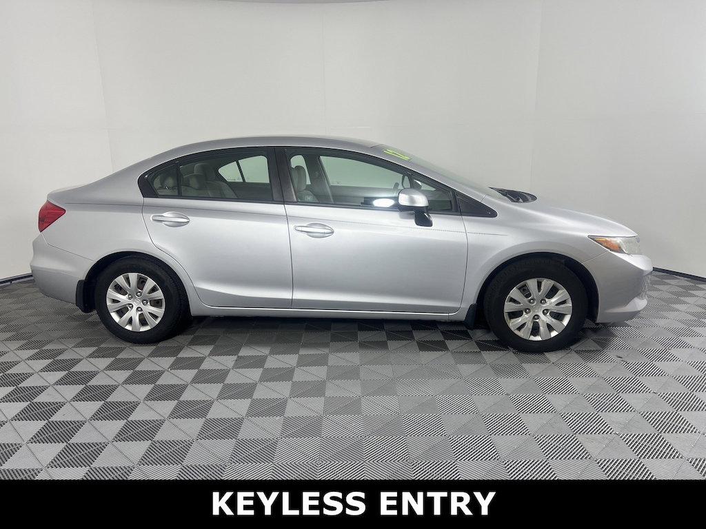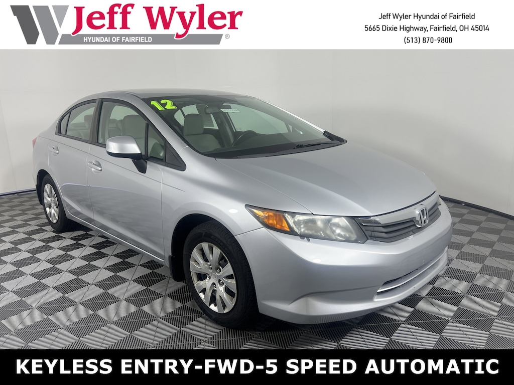 Jeff Wyler Hyundai of Fairfield is honored to offer this charming 2012 Honda Civic LX in Alabaster Silver Metallic. Well equipped with: Gray Cloth, Android Auto, Apple CarPlay, CALL NOW FOR YOUR VIP APPOINTMENT 513-870-9800, FULLY SERVICED w/RECORDS, GUARANTEED FINANCING!! NO MATTER YOUR SITUATION WE CAN GET AN APPROVAL!!, THE #1 Volume dealer in the region! Come see why for yourself Today!!, WE PAY MORE FOR YOUR TRADE!!, 15" Wheels w/Full Covers, 160-Watt AM/FM/CD Audio System, 4 Speakers, ABS brakes, Air Conditioning, AM/FM radio, Brake assist, Bumpers: body-color, CD player, Cloth Seat Trim, Delay-off headlights, Driver door bin, Driver vanity mirror, Dual front impact airbags, Dual front side impact airbags, Electronic Stability Control, Four wheel independent suspension, Front anti-roll bar, Front Bucket Seats, Front Center Armrest, Front reading lights, Illuminated entry, Low tire pressure warning, Occupant sensing airbag, Overhead airbag, Panic alarm, Passenger door bin, Passenger vanity mirror, Power door mirrors, Power steering, Power windows, Radio data system, Rear anti-roll bar, Rear window defroster, Reclining Front Bucket Seats, Remote keyless entry, Security system, Speed control, Speed-sensing steering, Steering wheel mounted audio controls, Tachometer, Telescoping steering wheel, Tilt steering wheel, Traction control, and Trip computer. Reviews: * * Engine choices include hybrid and natural gas versions * Excellent fuel economy * Relatively spacious for a compact sedan or coupe * Well-tuned suspension offering comfort with control Source: KBB.comTO CHECK ON THE AVAILABILITY OF THIS VEHICLE REACH OUT TO ONE OF OUR TEAM MEMBERS!! ALSO SHOP ONLINE AT https://www.jeffwylerhyundaioffairfield.com/ Proudly Serving: Cincinnati, Dayton, Columbus, Louisville, Lexington, Indianapolis, Hamilton, Florence, Alexandria, Beavercreek, Springdale, West Chester, Monroe, Fairfield, Kenwood, Newport and all of greater Cincinnati Ohio, Indiana, and Northern Kentucky.