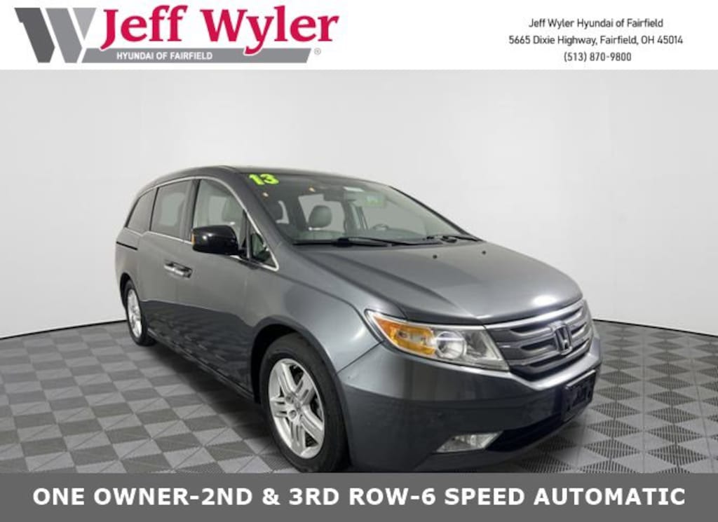 CARFAX One-Owner. Clean CARFAX. Jeff Wyler Hyundai of Fairfield is pumped up to offer this good-looking 2013 Honda Odyssey Touring in Polished Metal Metallic. Well equipped with: Android Auto, Apple CarPlay, CALL NOW FOR YOUR VIP APPOINTMENT 513-870-9800, FULLY SERVICED w/RECORDS, GUARANTEED FINANCING!! NO MATTER YOUR SITUATION WE CAN GET AN APPROVAL!!, THE #1 Volume dealer in the region! Come see why for yourself Today!!, WE PAY MORE FOR YOUR TRADE!!, 18" x 7" Alloy Wheels, 3rd row seats: split-bench, 4-Wheel Disc Brakes, 4.25 Axle Ratio, A/V remote, ABS brakes, Air Conditioning, Alloy wheels, AM/FM radio: XM, Anti-whiplash front head restraints, Auto-dimming Rear-View mirror, Automatic temperature control, Brake assist, Bumpers: body-color, CD player, Delay-off headlights, Driver door bin, Driver vanity mirror, Driver's Seat Mounted Armrest, Dual front impact airbags, Dual front side impact airbags, DVD-Audio, Electronic Stability Control, Exterior Parking Camera Rear, Four wheel independent suspension, Front anti-roll bar, Front Bucket Seats, Front dual zone A/C, Front fog lights, Front reading lights, Garage door transmitter: HomeLink, Headphones, Heated door mirrors, Heated Front Bucket Seats, Heated front seats, Illuminated entry, Leather Seat Trim, Leather Shift Knob, Low tire pressure warning, Memory seat, Navigation System, Occupant sensing airbag, Outside temperature display, Overhead airbag, Overhead console, Panic alarm, Passenger door bin, Passenger seat mounted armrest, Passenger vanity mirror, Power door mirrors, Power driver seat, Power Liftgate, Power moonroof, Power passenger seat, Power steering, Power windows, Radio data system, Rear air conditioning, Rear audio controls, Rear reading lights, Rear seat center armrest, Rear window defroster, Rear window wiper, Reclining 3rd row seat, Remote keyless entry, Security system, Speed control, Speed-sensing steering, Speed-Sensitive Wipers, Split folding rear seat, Spoiler, Steering wheel mounted audio controls, Tachometer, Telescoping steering wheel, Tilt steering wheel, Traction control, Trip computer, Turn signal indicator mirrors, Variably intermittent wipers, and XM Radio. TO CHECK ON THE AVAILABILITY OF THIS VEHICLE REACH OUT TO ONE OF OUR TEAM MEMBERS!! ALSO SHOP ONLINE AT https://www.jeffwylerhyundaioffairfield.com/ Proudly Serving: Cincinnati, Dayton, Columbus, Louisville, Lexington, Indianapolis, Hamilton, Florence, Alexandria, Beavercreek, Springdale, West Chester, Monroe, Fairfield, Kenwood, Newport and all of greater Cincinnati Ohio, Indiana, and Northern Kentucky.