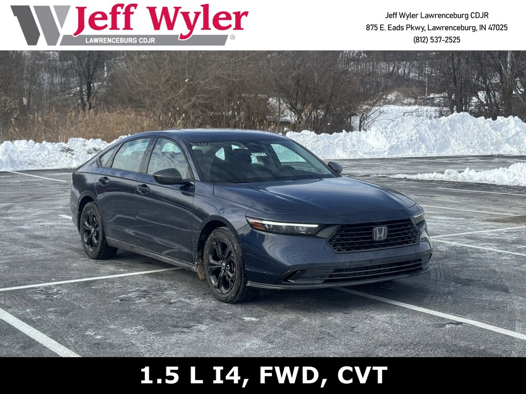 Jeff Wyler Chrysler Dodge Jeep of Lawrenceburg is pleased to offer this wonderful 2025 Honda Accord SE in Blue. Gray Cloth, 4-Wheel Disc Brakes, 8 Speakers, ABS brakes, Adaptive Cruise Control: Adaptive Cruise Control (ACC) with Low-Speed Follow, Air Conditioning, Alloy wheels, AM/FM radio, Apple CarPlay/Android Auto, Auto High-beam Headlights, Automatic temperature control, Blind Spot Information (BSI) System warning, Brake assist, Bumpers: body-color, Compass, Delay-off headlights, Driver door bin, Driver vanity mirror, Dual front impact airbags, Dual front side impact airbags, Electronic Stability Control, Emergency communication system: HondaLink Assist, Exterior Parking Camera Rear, Fabric Seat Trim, Four wheel independent suspension, Front anti-roll bar, Front Bucket Seats, Front Center Armrest, Front dual zone A/C, Front reading lights, Fully automatic headlights, Heated door mirrors, Heated Front Bucket Seats, Heated front seats, Illuminated entry, Knee airbag, Lane departure: Lane Keeping Assist System (LKAS) active, Low tire pressure warning, Occupant sensing airbag, Outside temperature display, Overhead airbag, Overhead console, Panic alarm, Passenger door bin, Passenger vanity mirror, Power door mirrors, Power driver seat, Power moonroof, Power steering, Power windows, Radio data system, Radio: 180-Watt Audio System, Rear anti-roll bar, Rear reading lights, Rear seat center armrest, Rear side impact airbag, Rear window defroster, Remote keyless entry, Security system, Speed control, Speed-sensing steering, Speed-Sensitive Wipers, Split folding rear seat, Steering wheel mounted audio controls, Tachometer, Telescoping steering wheel, Tilt steering wheel, Traction control, Trip computer, Variably intermittent wipers, and Wheels: 17" x 7.5J Berlina Black Our PRE-OWNED vehicles are put through a rigorous 167- POINT QUALITY ASSURANCE INSPECTION along with an average amount of over $1,400.00 SPENT to recondition each vehicle so we can be sure to deliver you the highest quality vehicle like you deserve! ***ONLINE PRICE DOES NOT INCLUDE WYLER FAMILY FIRST PACKAGE*** Stop by 4136 Shelbyville Road to see for yourself, or give us a call @ 502-897-3151 to schedule your test drive! Ask about available certifications.