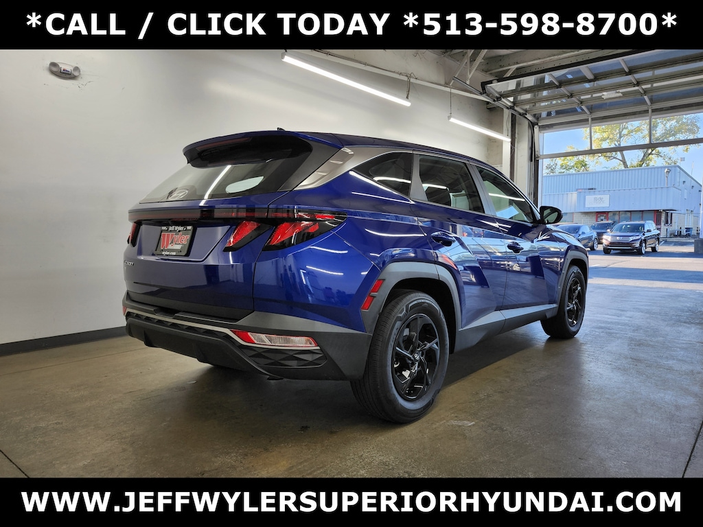 Jeff Wyler Superior Hyundai is honored to offer this superb 2022 Hyundai Tucson SE in Intense Blue. Well equipped with: Option Group 01, 3.648 Axle Ratio, 4-Wheel Disc Brakes, 6 Speakers, ABS brakes, Air Conditioning, Alloy wheels, AM/FM radio, Apple CarPlay & Android Auto, Auto High-beam Headlights, Brake assist, Bumpers: body-color, Carpeted Floor Mats, Delay-off headlights, Driver door bin, Driver vanity mirror, Dual front impact airbags, Dual front side impact airbags, Electronic Stability Control, Four wheel independent suspension, Front anti-roll bar, Front Bucket Seats, Front Center Armrest, Front reading lights, Fully automatic headlights, Illuminated entry, Low tire pressure warning, Occupant sensing airbag, Outside temperature display, Overhead airbag, Overhead console, Panic alarm, Passenger door bin, Passenger vanity mirror, Power door mirrors, Power steering, Power windows, Radio data system, Radio: AM/FM/HD Audio System, Rear anti-roll bar, Rear seat center armrest, Rear window defroster, Rear window wiper, Remote keyless entry, Security system, Speed control, Split folding rear seat, Spoiler, Stain & Odor Resistant Cloth Seat Trim, Steering wheel mounted audio controls, Tachometer, Telescoping steering wheel, Tilt steering wheel, Traction control, Trip computer, Variably intermittent wipers, and Wheels: 17" x 7.0J" Alloy. CARFAX One-Owner. Clean CARFAX. This sales price excludes tax, title, and dealer fees. While every reasonable effort is made to ensure the accuracy of this information, we are not responsible for any errors or omissions contained on these pages. Used vehicles 10 years of age or newer with less than 100,000 miles are eligible for the Wyler Assurance Program, but eligible vehicles must pass our reconditioning process and multi-point inspection. Provided the vehicle passes inspection, vehicles will be eligible for the 6 month/6,000 mile limited warranty. The 6 month/6,000 mile limited warranty is NOT available on AS-IS vehicles, wholesale vehicles, lease buyback/pass-thru vehicles or un-inspected vehicles. Note that this program can also apply to vehicles where the remaining factory coverage is less than 6 months or 6,000 miles. Please check the Federal Trade Commission (FTC) Buyers guide on the vehicle for full details as to whether or not warranty coverage may apply. Contact Dealer for additional details. The Wyler Assurance 6 month/6,000 Mile limited warranty ends 6 months from the date of the Retail Purchase Agreement (BUYERS ORDER) or when the vehicle's odometer registers 6,000 additional miles to the mileage listed on the BUYERS ORDER, whichever comes first.Your Deductible - The warranty holder on your contract pays the first $100 of each covered repair.