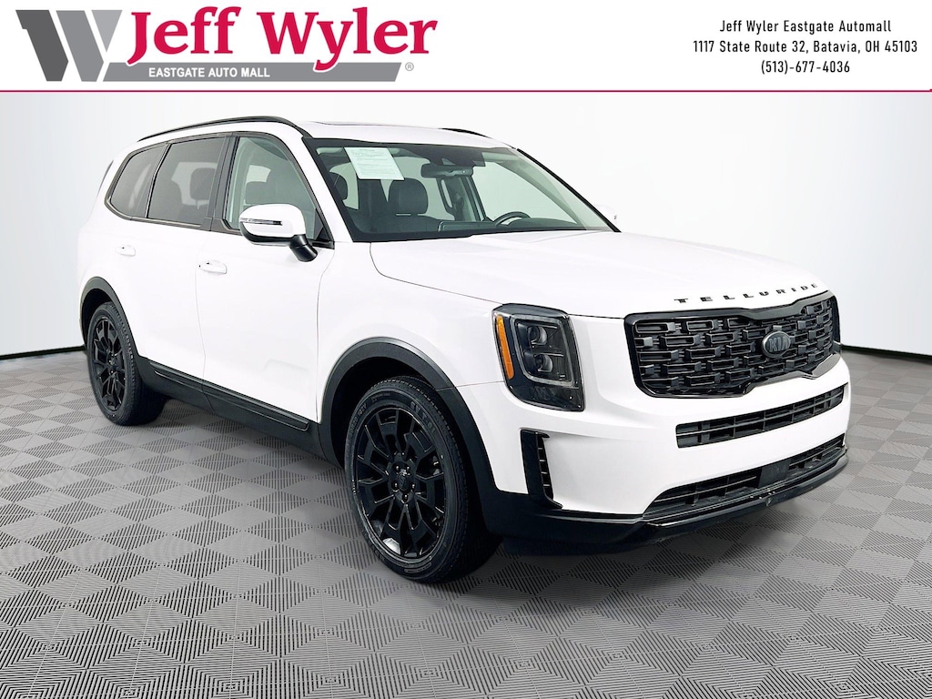 Jeff Wyler Eastgate Auto Mall is honored to offer this fantastic-looking 2021 Kia Telluride EX in Glacial White Pearl. Well equipped with: EX Premium Package (2nd Row Captain Chairs, LED Headlamps, Satin Chrome Roof Rails, and Wheels: 7.5" x 20" Machined Finish Alloy), Nightfall Edition Package (Black Finish Radiator Grille, Exclusive Black Headlight Bezels, Front & Rear Gloss Black Finish Bumper Skid Plates, Front & Rear KIA Logo, Gloss Black Finish Exterior Emblems, Gloss Black Finish Front & Rear Door Garnish, Gloss Black Finish Roof Rails, and Wheels: 7.5" x 20" Exclusive Black Finish Alloy), Towing Package (Self Leveling Rear Suspension and Tow Hitch w/Harness (TOF)), 3.648 Axle Ratio, 3rd row seats: split-bench, 4-Wheel Disc Brakes, 6 Speakers, ABS brakes, Air Conditioning, Alloy wheels, AM/FM radio: SiriusXM, Apple CarPlay & Android Auto, Auto-dimming Rear-View mirror, Automatic temperature control, Brake assist, Bumpers: body-color, Carpeted Floor Mats, Compass, Delay-off headlights, Driver door bin, Driver vanity mirror, Dual front impact airbags, Dual front side impact airbags, Electronic Stability Control, Emergency communication system: 911 Connect, Four wheel independent suspension, Front anti-roll bar, Front Bucket Seats, Front Center Armrest, Front dual zone A/C, Front reading lights, Fully automatic headlights, Heated & Ventilated Front Bucket Seats, Heated door mirrors, Heated front seats, Heated steering wheel, Illuminated entry, Knee airbag, Leather Seat Trim, Leather Shift Knob, Leather steering wheel, Low tire pressure warning, Navigation System, Occupant sensing airbag, Outside temperature display, Overhead airbag, Overhead console, Panic alarm, Passenger door bin, Passenger vanity mirror, Power door mirrors, Power driver seat, Power Liftgate, Power moonroof, Power passenger seat, Power steering, Power windows, Radio data system, Radio: AM/FM/SIRIUS Display Audio, Rear air conditioning, Rear anti-roll bar, Rear audio controls, Rear reading lights, Rear seat center armrest, Rear window defroster, Rear window wiper, Reclining 3rd row seat, Remote keyless entry, Roof rack: rails only, Security system, Smart Key w/ Push Button and Remote Start, Speed control, Speed-sensing steering, Split folding rear seat, Spoiler, Steering wheel mounted audio controls, Tachometer, Telescoping steering wheel, Tilt steering wheel, Traction control, Trip computer, Turn signal indicator mirrors, Variably intermittent wipers, Ventilated front seats, and Wheels: 7.5" x 18" Machined Finish Alloy. CARFAX One-Owner. Awards: * JD Power Automotive Performance, Execution and Layout (APEAL) Study, Initial Quality Study (IQS) * JD Power Initial Quality Study (IQS) Ask about available certifications. Used vehicles 10 years of age or newer with less than 100,000 miles are eligible for the Wyler Assurance Program, but eligible vehicles must pass our reconditioning process and multi-point inspection. Provided the vehicle passes inspection, vehicles will be eligible for the 6 month/6,000 mile limited warranty. The 6 month/6,000 mile limited warranty is NOT available on AS-IS vehicles, wholesale vehicles, lease buyback/pass-thru vehicles or un-inspected vehicles. Note that this program can also apply to vehicles where the remaining factory coverage is less than 6 months or 6,000 miles. Please check the Federal Trade Commission (FTC) Buyers guide on the vehicle for full details as to whether or not warranty coverage may apply. Contact Dealer for additional details. The Wyler Assurance 6 month/6,000 Mile limited warranty ends 6 months from the date of the Retail Purchase Agreement (BUYERS ORDER) or when the vehicle's odometer registers 6,000 additional miles to the mileage listed on the BUYERS ORDER, whichever comes first. Your Deductible - The warranty holder on your contract pays the first $100 of each covered repair.