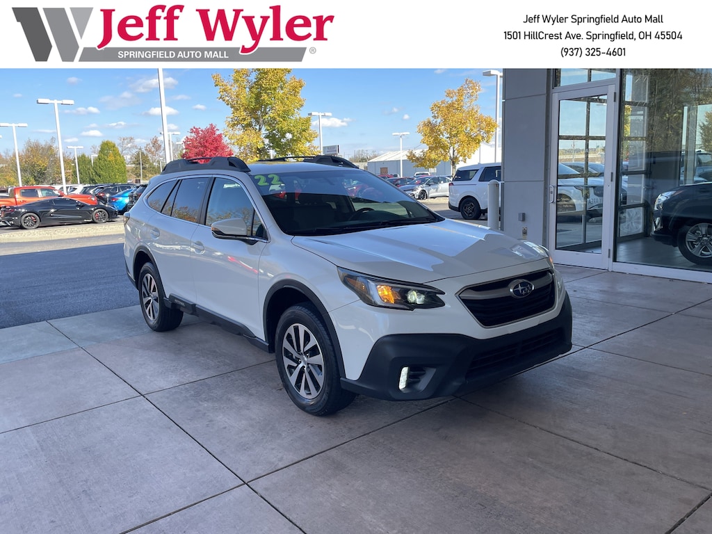 Jeff Wyler Springfield Auto Mall is excited to offer this fantastic 2022 Subaru Outback Premium in Crystal White Pearl. Well equipped with: BSD w/RCTA & Keyless Access & Push Button Start (Blind Spot Detection (BSD), Hands-Free Power Rear Gate, Keyless Access w/Push Button Start, and Rear Cross Traffic Alert (RCTA)), 3.90 Axle Ratio, 4-Wheel Disc Brakes, 6 Speakers, ABS brakes, Air Conditioning, Alloy wheels, AM/FM radio: SiriusXM, Auto High-beam Headlights, Automatic temperature control, Brake assist, Bumpers: body-color, Cloth Upholstery, Driver door bin, Driver vanity mirror, Dual front impact airbags, Dual front side impact airbags, Electronic Stability Control, Emergency communication system: STARLINK Safety and Security (Subscription Required), Exterior Parking Camera Rear, Four wheel independent suspension, Front anti-roll bar, Front Bucket Seats, Front Center Armrest w/Storage, Front dual zone A/C, Front fog lights, Front reading lights, Fully automatic headlights, Heated door mirrors, Heated Front Bucket Seats, Heated front seats, Illuminated entry, Knee airbag, Leather steering wheel, Low tire pressure warning, Occupant sensing airbag, Outside temperature display, Overhead airbag, Overhead console, Panic alarm, Passenger door bin, Passenger vanity mirror, Power door mirrors, Power driver seat, Power steering, Power windows, Radio: Subaru STARLINK 11.6" Multimedia Plus Sys, Rear anti-roll bar, Rear seat center armrest, Rear window defroster, Rear window wiper, Remote keyless entry, Roof rack, Security system, Speed control, Speed-sensing steering, Split folding rear seat, Spoiler, STARLINK/Apple CarPlay/Android Auto, Steering wheel mounted audio controls, Steering Wheel Paddle Shift Control Switches, Tachometer, Telescoping steering wheel, Tilt steering wheel, Traction control, Trip computer, Turn signal indicator mirrors, Variably intermittent wipers, and Wheels: 17" x 7J Black Aluminum Alloy. Ask about available certifications. Used vehicles 10 years of age or newer with less than 100,000 miles are eligible for the Wyler Assurance Program, but eligible vehicles must pass our reconditioning process and multi-point inspection. Provided the vehicle passes inspection, vehicles will be eligible for the 6 month/6,000 mile limited warranty. The 6 month/6,000 mile limited warranty is NOT available on AS-IS vehicles, wholesale vehicles, lease buyback/pass-thru vehicles or un-inspected vehicles. Note that this program can also apply to vehicles where the remaining factory coverage is less than 6 months or 6,000 miles. Please check the Federal Trade Commission (FTC) Buyers guide on the vehicle for full details as to whether or not warranty coverage may apply. Contact Dealer for additional details. The Wyler Assurance 6 month/6,000 Mile limited warranty ends 6 months from the date of the Retail Purchase Agreement (BUYERS ORDER) or when the vehicle's odometer registers 6,000 additional miles to the mileage listed on the BUYERS ORDER, whichever comes first. Your Deductible - The warranty holder on your contract pays the first $100 of each covered repair.