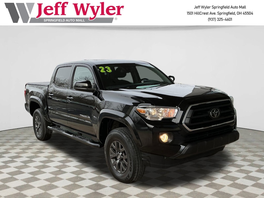 Jeff Wyler Springfield Auto Mall is honored to offer this good-looking 2023 Toyota Tacoma SR5 in Black. Well equipped with: ABS brakes, Active Cruise Control, Alloy wheels, Electronic Stability Control, Front dual zone A/C, Heated door mirrors, Illuminated entry, Low tire pressure warning, Remote keyless entry, Traction control, 6 Speakers, Air Conditioning, AM/FM radio: SiriusXM, Anti-whiplash front head restraints, Apple CarPlay/Android Auto, Auto High-beam Headlights, Auto-dimming Rear-View mirror, Automatic temperature control, Axle Ratio: 3.91, Black Headlamp Bezel, Brake assist, Bumpers: body-color, Daytime Running Lamps, Driver door bin, Dual front impact airbags, Dual front side impact airbags, Emergency communication system: Safety Connect (1-year trial), Exterior Parking Camera Rear, Fabric Seat Trim, Front anti-roll bar, Front Bucket Seats, Front Center Armrest, Front fog lights, Front reading lights, Front Seats, Front wheel independent suspension, Knee airbag, Occupant sensing airbag, Outside temperature display, Overhead airbag, Overhead console, Panic alarm, Passenger door bin, Power door mirrors, Power driver seat, Power steering, Power windows, Radio: Audio, Rear step bumper, Speed control, Speed-sensing steering, Split folding rear seat, Steering wheel mounted audio controls, Tachometer, Telescoping steering wheel, Tilt steering wheel, Trip computer, Variably intermittent wipers, and Wheels: 16" Dark Gray Alloy. Ask about available certifications. Used vehicles 10 years of age or newer with less than 100,000 miles are eligible for the Wyler Assurance Program, but eligible vehicles must pass our reconditioning process and multi-point inspection. Provided the vehicle passes inspection, vehicles will be eligible for the 6 month/6,000 mile limited warranty. The 6 month/6,000 mile limited warranty is NOT available on AS-IS vehicles, wholesale vehicles, lease buyback/pass-thru vehicles or un-inspected vehicles. Note that this program can also apply to vehicles where the remaining factory coverage is less than 6 months or 6,000 miles. Please check the Federal Trade Commission (FTC) Buyers guide on the vehicle for full details as to whether or not warranty coverage may apply. Contact Dealer for additional details. The Wyler Assurance 6 month/6,000 Mile limited warranty ends 6 months from the date of the Retail Purchase Agreement (BUYERS ORDER) or when the vehicle's odometer registers 6,000 additional miles to the mileage listed on the BUYERS ORDER, whichever comes first. Your Deductible - The warranty holder on your contract pays the first $100 of each covered repair.